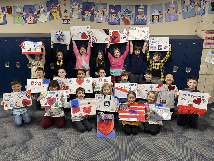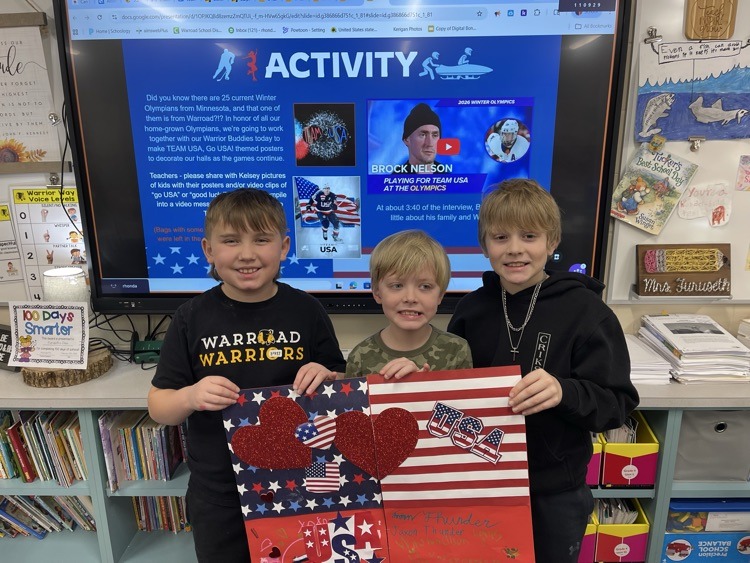 ❤️🤍💙🥇Warrior Buddies connected this morning to learn more about Warroad's own Olympian, Brock Nelson, and to make Team USA posters to decorate our halls as we continue to celebrate the Olympic spirit this month!