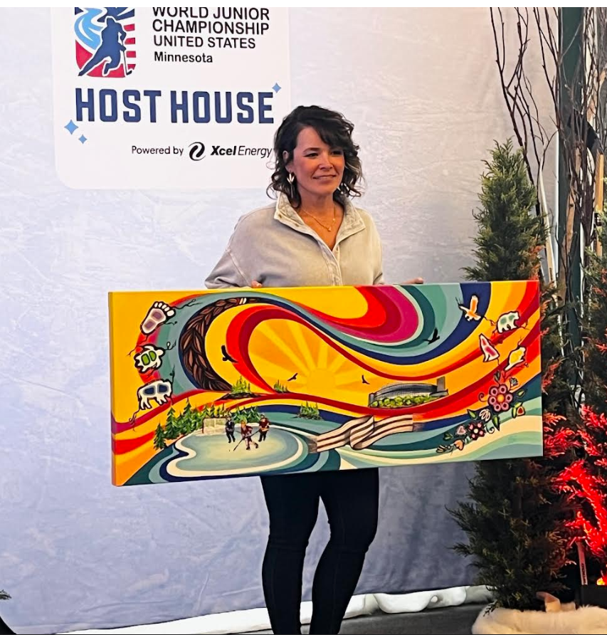 Her stunning artwork, Land of 10,000 Rinks, was showcased at the 2026 World Juniors in Minneapolis. The piece beautifully highlights the deep cultural significance and enduring connection between Native American culture and the sport of hockey in Minnesota. It was also printed and awarded during each player of the game presentation(s).